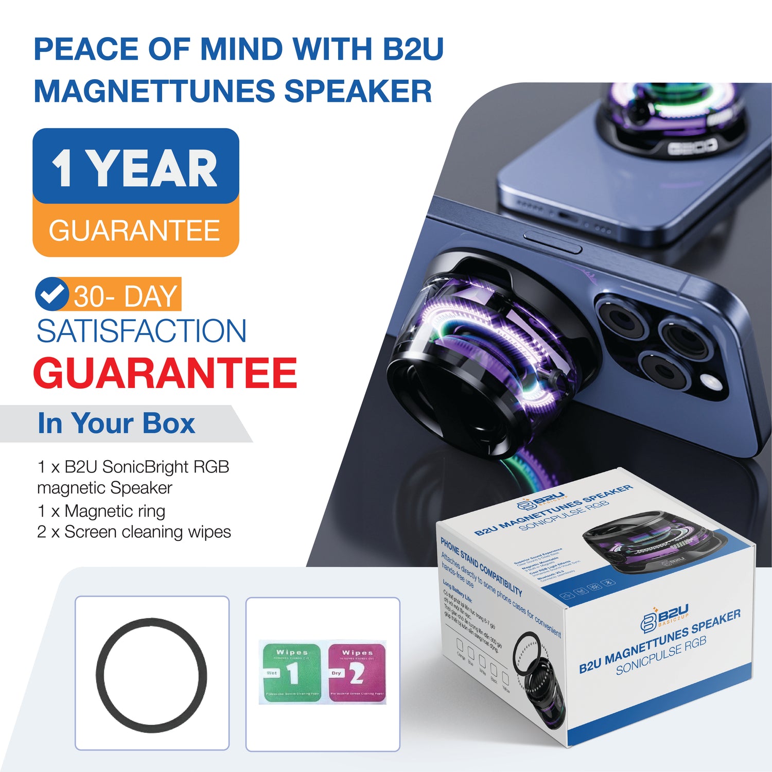 The B2U SonicBright™ stands out due to its advanced features, including crystal-clear audio with deep bass, vibrant RGB dynamic lighting, and a magnetic mounting system with 9 strong magnets. It combines superior sound quality with a stylish, compact design perfect for any environment—whether at home, outdoors, or on the go.